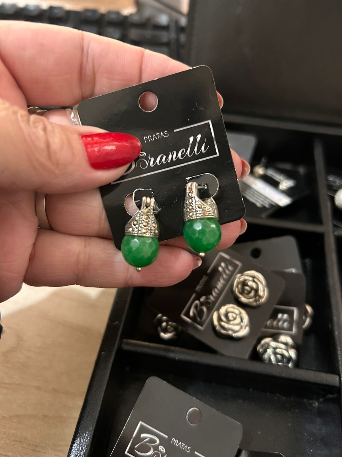 Brinco em Prata 925, com pedra natural em esmeralda indiana facetada e com detalhes em pedras de marcassita.